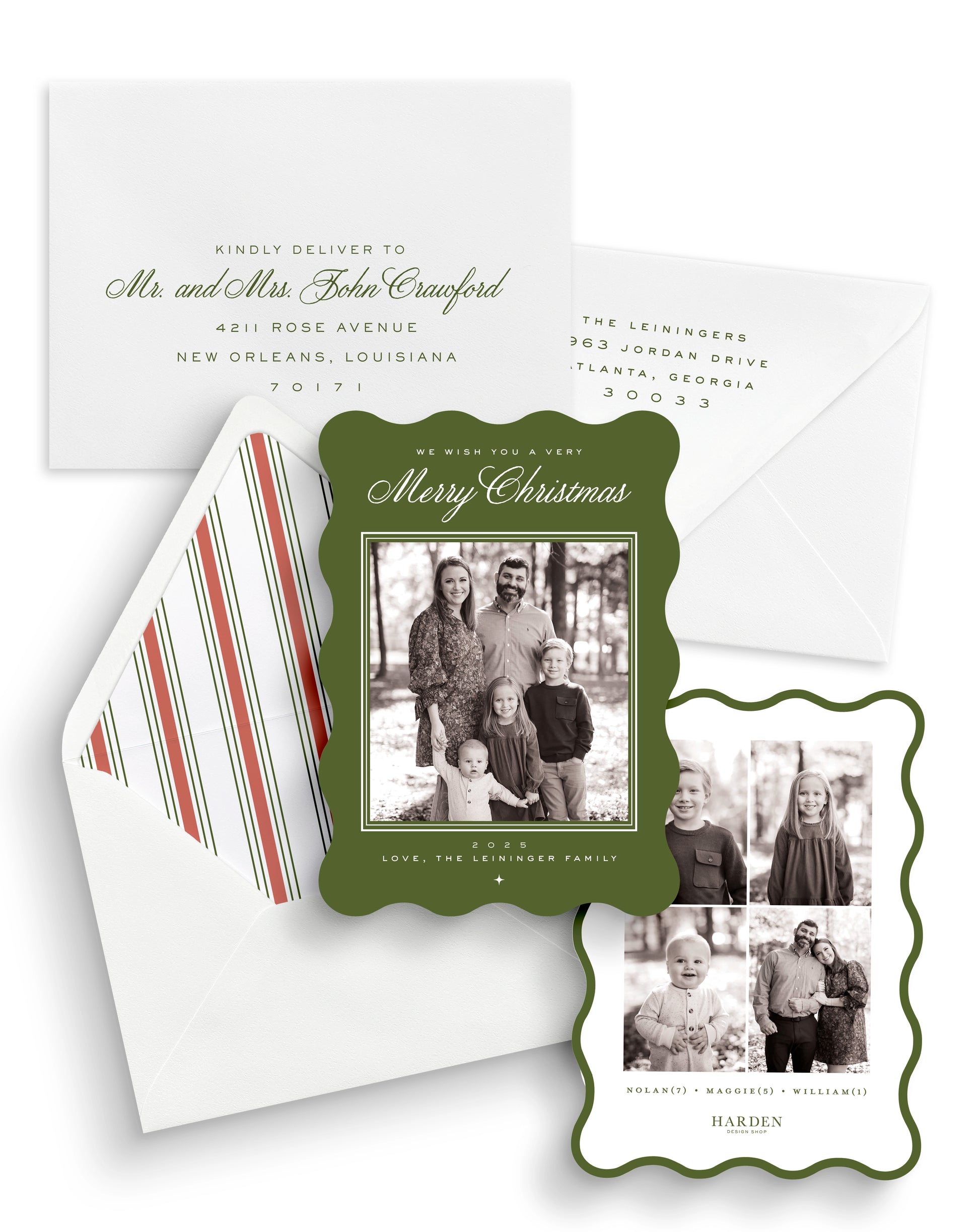 - Personalized double-sided card (front photo with optional back photo) featuring a wavy die-cut and matching lined envelopes.